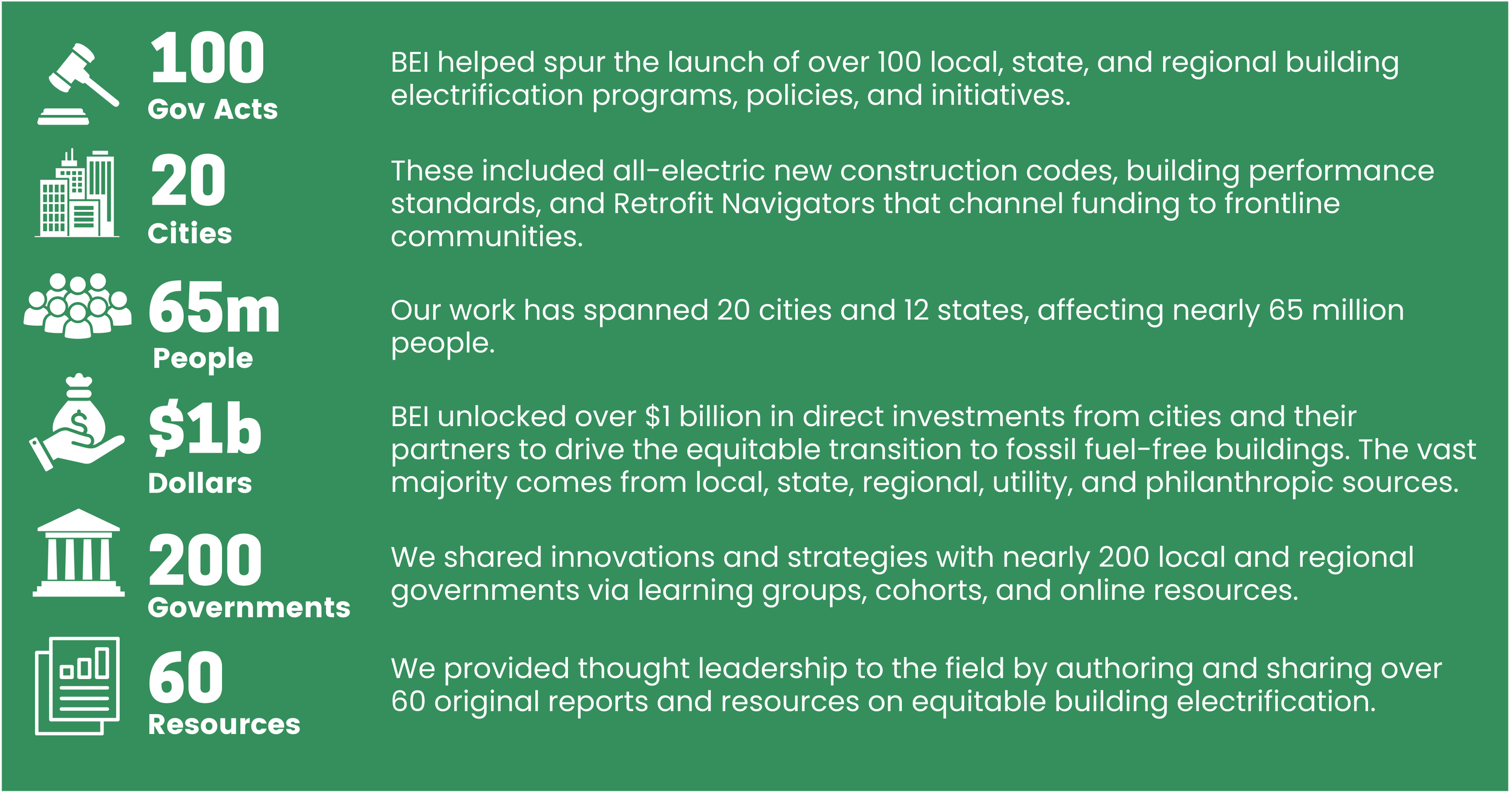 Learn details of BEI’s work from 2018-2025 in cities and states in our Impact Tracker
